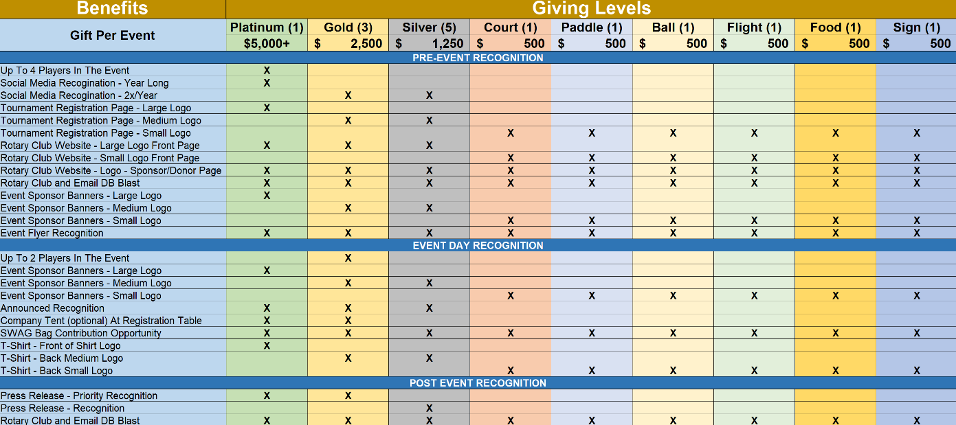 This is be our club's big fundraiser for FY 2022-2023. For the most part, our club hasn't done a significant fundraiser for the past two years primarily due to COVID. The Sandy Springs Tennis Center is allowing us to use all six of their Pickleball courts for four hours at no cost which is a cost savings of at least $600. The event will take place on 4/14/23 with a rain date of 2/21/23. We'll have use of the courts from 2:30-6:30. We'll have two flights of players based on their skill level. We are seeking sponsors, see one of the attached pictures. We anticipate 80 players each paying $75. We're providing awards for the highest and second highest male and female player in each flight. Vision To Learn is our Sponsored Charity. A portion of the net proceeds will be allocated to Vision To Learn. There will be a significant amount of Rotary branding at this event.